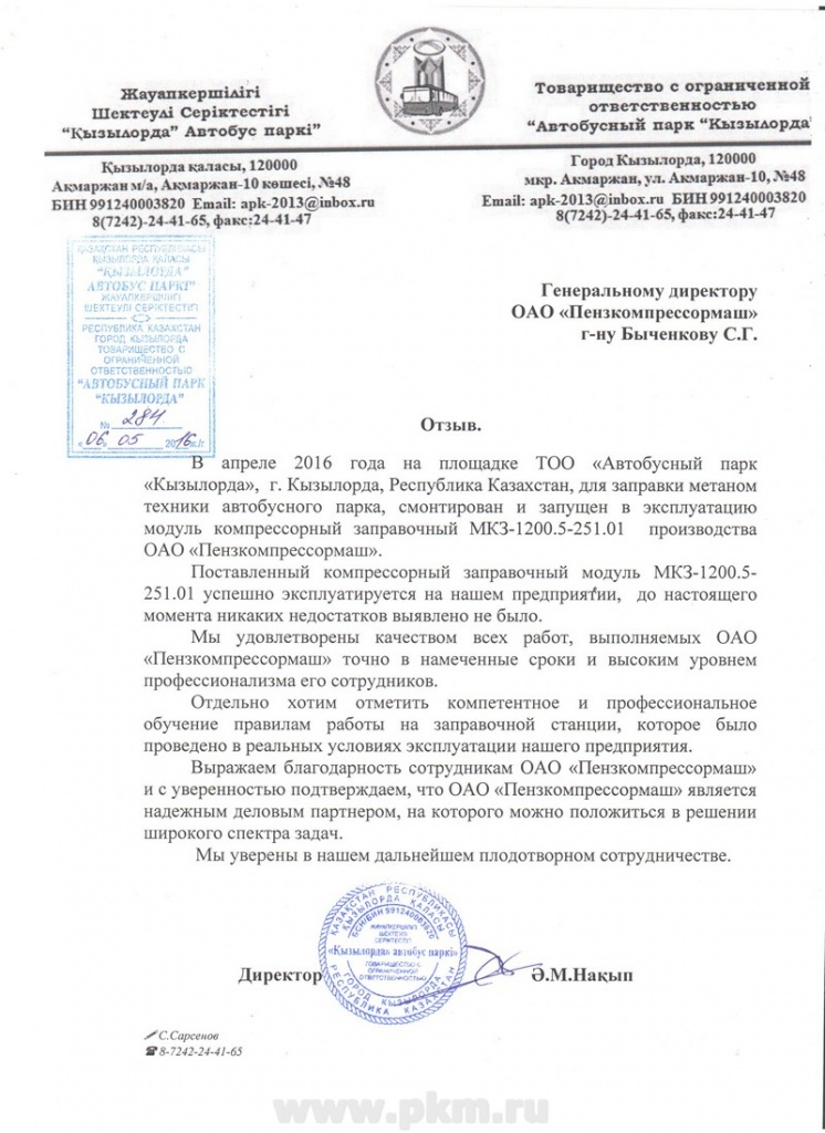 В апреле 2016 года на площадке ТОО «Автобусный парк «Кызылорда», г. Кызылорда, Республика Казахстан, для заправки метаном техники автобусного парка, смонтирован и запущен в эксплуатацию модуль компрессорный заправочный МКЗ-1200.5-251.01 производства ОАО «Пензкомпрессормаш». Поставленный компрессорный заправочный модуль МКЗ-1200.5-251.01 успешно эксплуатируется на нашем предприятии, до настоящего момента никаких недостатков выявлено не было. Мы удовлетворены качеством всех работ, выполняемых ОАО «Пензкомпрессормаш» точно в намеченные сроки и высоким уровнем профессионализма его сотрудников. Отдельно хотим отметить компетентное и профессиональное обучение правилам работы на заправочной станции, которое было проведено в реальных условиях эксплуатации нашего предприятия. Выражаем благодарность сотрудникам ОАО «Пензкомпрессормаш» и с уверенностью подтверждаем, что ОАО «Пензкомпрессормаш» является надежным деловым партнером, на которого можно положиться в решении широкого спектра задач. Мы уверены в нашем дальнейшем плодотворном сотрудничестве.