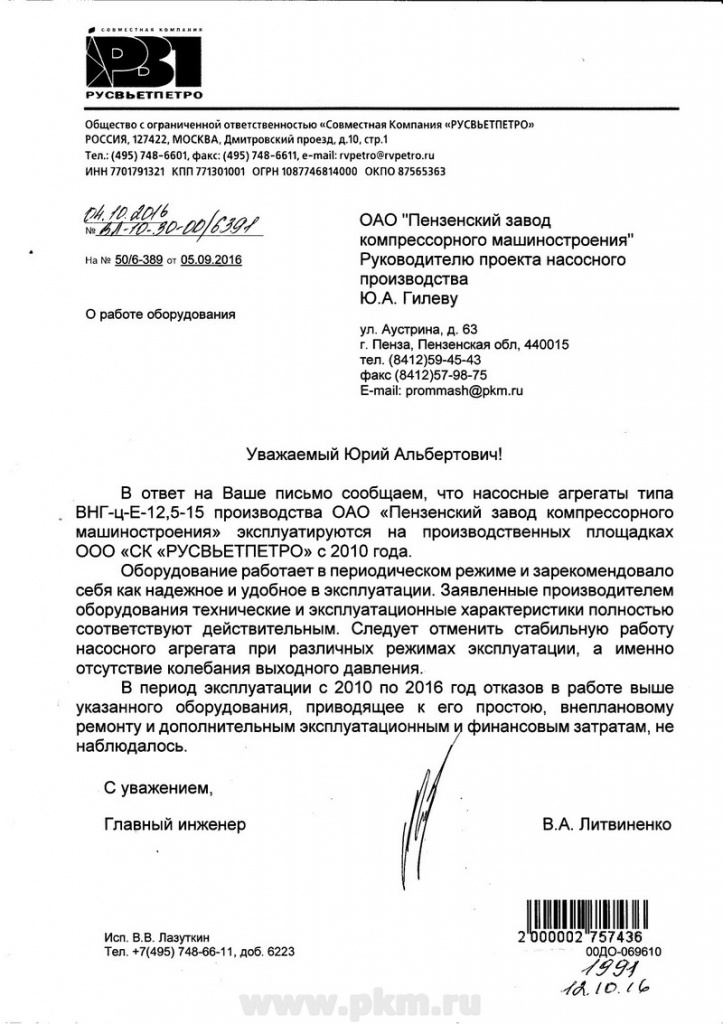 Насосные агрегаты типа ВНГ-ц-Е-12,5-15 производства ОАО «Пензенский завод компрессорного машиностроения» эксплуатируются на производственных площадках ООО «СК «РУСВЬЕТПЕТРО» с 2010 года. Оборудование работает в периодическом режиме и зарекомендовало себя как надежное и удобное в эксплуатации. Заявленные производителем оборудования технические и эксплуатационные характеристики полностью соответствуют действительным. Следует отменить стабильную работу насосного агрегата при различных режимах эксплуатации, а именно отсутствие колебания выходного давления. В период эксплуатации с 2010 по 2016 год отказов в работе выше указанного оборудования, приводящее к его простою, внеплановому ремонту и дополнительным эксплуатационным и финансовым затратам, не наблюдалось.
