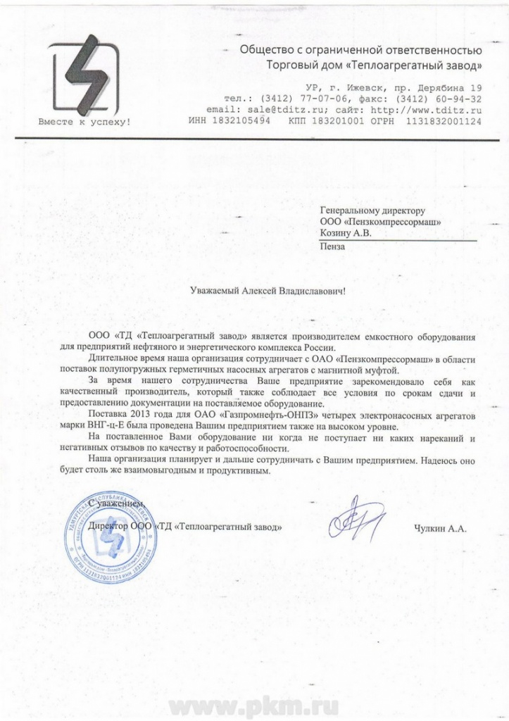 ООО «ТД «Теплоагрегатный завод» является производителем емкостного оборудования для предприятий нефтяного и энергетического комплекса России. Длительное время наша организация сотрудничает с ОАО «Пензкомпрессормаш» в области поставок полупогружных герметичных насосных агрегатов с магнитной муфтой. За время нашего сотрудничества Ваше предприятие зарекомендовало себя как качественный производитель, который также соблюдает все условия по срокам сдачи и предоставлению документации на поставляемое оборудование. Поставка 2013 года для ОАО «Газпромнефть-ОНПЗ» четырех электронасосных агрегатов марки ВНГ-ц-Е была проведена Вашим предприятием также на высоком уровне. На поставленное Вами оборудование ни когда не поступает ни каких нареканий и негативных отзывов по качеству и работоспособности. Наша организация планирует и дальше сотрудничать с Вашим предприятием. Надеюсь оно будет столь же взаимовыгодным и продуктивным.